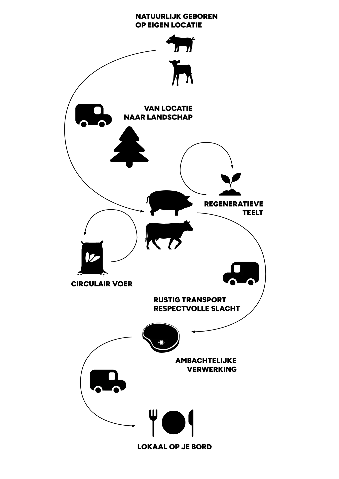 Van geboorte tot bord houden we de keten zelf in de hand. Met respect voor dier, bodem en product. Rustig transport, zorgvuldige verwerking en ambacht zorgen ervoor dat elk stukje vlees klopt. Lokaal, circulair en met een smaak die je terugbrengt naar de oorsprong.